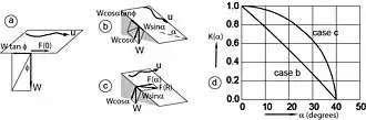 In onderstaande uitleg is φ de helling van natuurlijk talud van het bodemmateriaal. Er is een component langs de helling (W sinα), waardoor het effectieve gewicht loodrecht op de helling minder wordt (Wcosα). Als de helling in dezelfde richting is als de stroming(figuur b) dan wordt de sterkte F(αloodrecht) = Wcosα tanφ - Wsinα (Opmerking: als de stroming de andere kant op is, is de steen stabieler en is F=Wcosα tanφ+ Wsinα.) Het verband tussen F(α) en F(0) geeft de reductiefactor voor de sterkte: