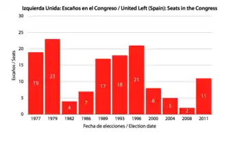 Na de electorale val van de PCE in 1982 (van 10% naar 3%), verbeterde IU langzaam haar resultaten en het bereikte 9% in 1993 (1.800.000 stemmen) en bijna 11% in 1996 (2,6 miljoen stemmen). Vanaf 1999 daalde de resultaten weer naar 5% in 2000. In die verkiezing had de coalitie een pact met de Spaanse Socialistische Arbeiderspartij (PSOE).