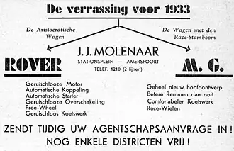 Naast de andere merken verkocht J.J. Molenaar vanaf begin 1932 MG’s en op 1 januari 1933 werd hij officieel importeur van dat merk. In 1936 stopte de Morris-vestiging in Delft met leveren en mede door de persoonlijke contacten van J.J. Molenaar met William Morris werd de import van Morris-personenauto’s en vrachtwagens overgedragen aan zijn bedrijf.