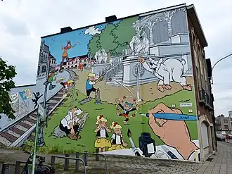 - De in 2017 geopende en destijds grootste stripmuur van Vlaanderen toont verschillende personages uit de stripreeks Jommeke die cricket spelen voor de tempel.[39]