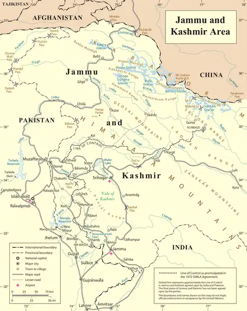Volgens India valt heel Jammu en Kasjmir (ook de door Pakistanen en Chinezen beheerste gebieden) onder haar grondgebied. Pakistan beschouwt heel Jammu en Kasjmir als betwist gebied en stelt dat de eis van India niet geldig is. Kasjmir vormt de inzet van een langdurig territoriaal geschil tussen de drie landen, het Kasjmirconflict.
