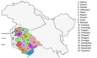 Als unieterritorium is Jammu en Kasjmir bestuurlijk onderverdeeld in 20 districten, gegroepeerd in twee divisies: