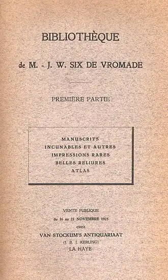 De veilingcatalogi leren dat de bibliotheek bestond uit exemplaren uit bibliotheken van onder anderen Valerius Röver (1686-1719), Balthazar Huydecoper (1695-1778) en Isaac Meulman (1807-1902). Recentere aanwinsten waren afkomstig uit de bibliotheken van literatuurhistoricus G.D.J. Schotel (1807-1902), bibliofiel Gustave van Havre (1817-1892), Joseph Alberdingk Thijm en kunsthandelaar Vincent van Gogh (1866-1911).