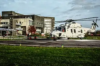 Een NH90, van de SAR, geland op de helikopterhaven van het Jan Yperman Ziekenhuis