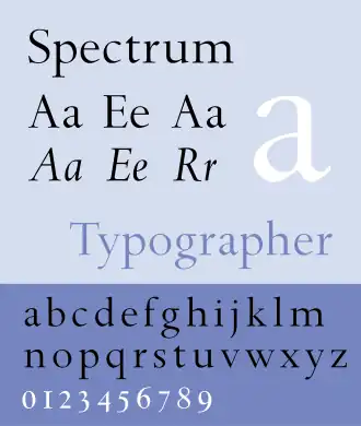 Van Krimpen ontwierp de Spectrum. Het was een dure letter, enkel het graveren van de stempels (patrijzen) werd geraamd op 60.000 gulden, daarom besloten Enschedé en Monotype de letter samen uit te brengen. Enschedé als handletter, en Monotype als matrijzen voor de zetsel-gietmachine.