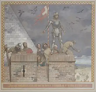 Item op den xvi. dach in Julius syn sommige ruter van den Rosendael geweest, ende hebben den toern ende kerck tot Bernevelt ingenomen, ende hoere was xix die 't deden, ende die van Amersfoert ende die ruters van die Nyekerck toghen voer die kerck, ende brochten bussen mede, ende scoten doer den toern, ende scoten daer vier of vyf doot. Die op den toern waren gheerden spraeck te houden alst geschiede. Ende die gheen die op den toern waren hadden geern in handen gegaen, ende hem gevangen gegeven. Ende die van Amersfoert antwoerden, dat syse niet in handen nemen en wouden, sy en mosten enen geheten Jan van Scaffelaer te galmgaten uytwerpen van den toern, dat die gheen die op den toern waren niet doen en wouden. Doe seyde Jan van Scaffelaer, Lieve gesellen, ic moet ummer sterven, ic en wil u in genen last brenghen. Ende ginck boven op die tynnen van den toern staen, ende setten syn handen in syn syde, ende spranck van boven neder. mer hy en viel niet doot, mer doe hy lach, doe wert hy dootgeslagen, als voersz staet, als my gesegt is.[5]