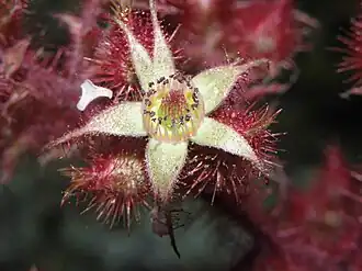 De plant is een makkelijk groeiende struik, waarvan de stengels tot drie meter lang kunnen worden. De bladeren zijn aan de bovenzijde lichtgroen en aan de onderzijde grijs. Aan de stengels en de bladstelen zitten naast zeer veel roodbruine klierhaartjes ook stekels, die bij aanraking in de huid achter kunnen blijven. De twijgen zijn lichtgroen, maar verkleuren later rood.