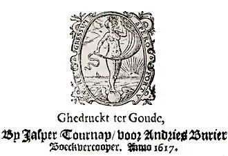 - ↑ Deze Cralingerbrug is in 1954 afgebroken toen de gracht werd gedempt, de brug staat bekend als Van Craelingenbrug, Cralenbrugge en Coralenbrug (bron: De namen der Goudse straten (blz. 339) door dr. A. Scheygrond). Jasper Tournay noemt deze brug op een titelblad van een door hem in deze periode gedrukte uitgave (zie afbeelding).