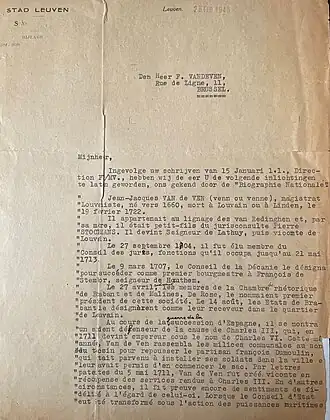 - ↑ (fr) Lettre Patente erigeant le titre de vicomte de Louvain au benefice de Jean Jacques van de Ven[dode link], Barcelona, 5 mei 1711