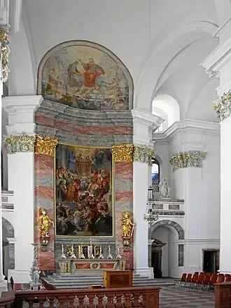 Het interieur van de kerk is wit en alleen de kapitelen van de zuilen hebben een groene kleur en gedeeltelijke vergulding. De drie altaren zijn met fresco’s voorzien: het hoofdaltaar toont de voorstelling van het Pinksterwonder, de nevenaltaren de opname van Maria in de hemel en Jozef als patroon van de katholieke kerk. De altaarschilderijen stammen uit het jaar 1871 en werden door Andreas Müller en Ferdinand Keller gemaakt. Eveneens 19e-eeuws zijn de marmeren kansel en de kunstzinnig vormgegeven paaskandelaar. De beeldhouwer Julius Seitz schiep in 1905 de piëta in het rechter zijschip.