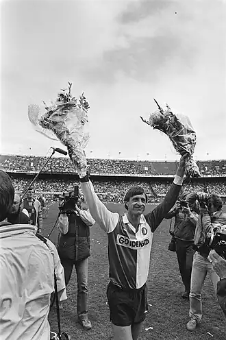In de laatste maanden van het seizoen kwam Cruijff in conflict met Ajax-voorzitter Harmsen. Het bestuurslid vond Cruijff te oud en wilde zijn salaris van anderhalf miljoen gulden niet uitbetalen.[93] Gedreven door rancune over de behandeling door het Ajax-bestuur gaf Cruijff aan Coster de opdracht om contact te zoeken met Feyenoord voor een onvoorstelbaar geachte overstap naar de aartsrivaal.[94] Na maanden van onderhandelingen kwamen partijen tot een overeenstemming, waarbij een soortgelijke beloningsconstructie op recettebasis werd opgezet als bij Ajax, aangezien de clubkas van Feyenoord bijna leeg was.[95] Op 10 mei 1983 kondigde Cruijff zijn afscheid aan. Een week later, na de gewonnen bekerfinale, vertrok het clubicoon.[7]