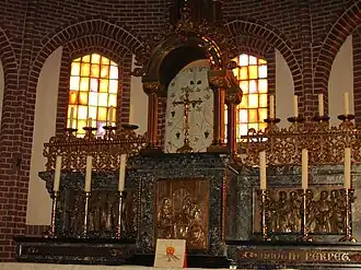 Het hoogaltaar is van marmer en op de tabernakeldeur is het verhaal van de Emmaüsgangers afgebeeld. Links en rechts van het tabernakel zijn op de kaarsenbanken de twaalf apostelen afgebeeld. Ook staat hier de tekst "Altare privilegiatum quotidianum perpetuum". Dat betekent dat er een volledige aflaat werd verleend voor de overledenen voor wie er op dit altaar een Mis werd opgedragen. Op de mensa is het offer van Melchisedek afgebeeld.