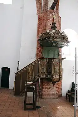 De kansel wordt op het jaar 1636 gedateerd en werd in de stijl van het maniërisme gebouwd. Onduidelijk is wie de kansel maakte, maar de kansel en het klankbord getuigen van een dermate hoge kwaliteit, dat een lokale bouwer wordt uitgesloten. Vermoed wordt dat een beeldhouwer uit de Nederlanden het meubelstuk maakte, die zich door Italiaanse voorbeelden liet beïnvloeden. Aan de kanselkuip worden de evangelisten uitgebeeld. Het klankbord is met cartouches en gevleugelde engelenkoppen versierd. Het beeld van de triomferende Christus vormt de bekroning van het klankbord.