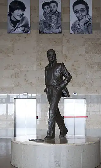 Beeld van John Lennon in de ontvangsthal van John Lennon Airport in Liverpool