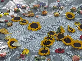Straatkunst afbeelding van Lennon op de John Lennon Muur in Praag.In Central Park, tegenover het appartement van Lennon en Yoko Ono, werd later een herdenkingsmonument opgericht: het Strawberry Fields memorial.