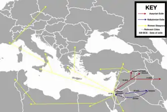 Van Babylonië en van Palestina uit verspreidde de Joodse diaspora zich in de daaropvolgende eeuwen via Syrië naar Klein-Azië, naar Mesopotamië, het Arabisch schiereiland en naar Centraal-Azië. In de tijd van het Hellenisme waren de meeste joodse nederzettingen te vinden in Egypte. Daarnaast waren er nederzettingen in Cyrenaica, in havensteden in het oostelijke Middellandse Zeegebied, langs de Zwarte Zee en uiteindelijk ook in Rome.