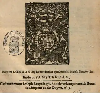 - By Den Coninck Een Proclamatie, verklarende syn Majesteyts genadighste wille, nopende eenighe Octroyen, Licenten ende Commissien op onwaerachtige aanbrenghen, verkreghen. Eerst tot London, by Robert Barker sijn Coninckl. Majest. Drucker, &c. Ende nu t'Amsterdam Gedruckt voor Joseph Bruyningh, Воeck verkooper aende Beurs int Serpent en de Duyve, 1639.