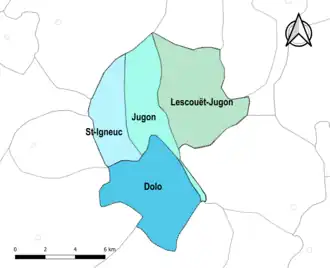 Jugon-les-Lacs - Commune nouvelle is op 1 januari 2016 ontstaan uit een fusie van de gemeenten Dolo en Jugon-les-Lacs. Op 1 januari 2024 werd de gemeente officieel hernoemd naar Jugon-les-Lacs.