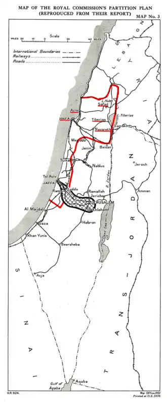 - 10[1] - De Commissie-Peel publiceert haar voorstel voor een verdeling van Palestina. Het oosten wordt verenigd met Transjordanië, het westen komt aan de Joden en de Britten houden het mandaat over een enclave rond Jeruzalem en Bethlehem met een corridor naar de zee bij Jaffa. Zowel van Joodse als van Arabische wijze wordt het voorstel sterk verworpen.