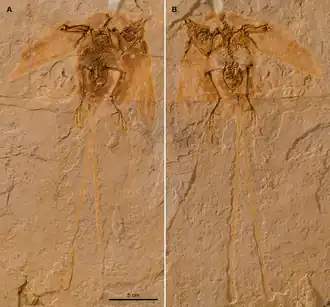 Een gedeelte van het verenkleed is vervalst door de fossielenhandelaren die de punt van de linkervleugel met enkele penseelstreken verlengden. De rechtervleugel duidt op een lengte van de slagpennen van zo'n zeven centimeter. De contourveren hebben een lengte tussen de vier en elf millimeter.