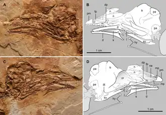 De snuit is spits maar de punt ervan licht afgerond. Snuit en onderkaken zijn licht naar beneden gebogen. De praemaxilla draagt vier tanden waarvan de voorste twee pinvormig zijn. Er staan tanden in het bovenkaaksbeen. De onderkaak draagt minstens zeven tanden. De tongbeenderen zijn opvallend lang met de helft van de lengte van de schedel.