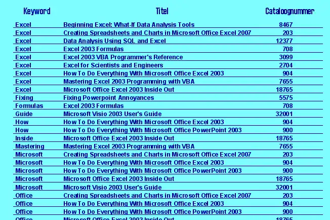 Voorbeeld van een KWOC-index van een fictieve catalogus van computerboeken:
