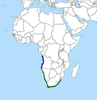 Deze soort komt voor aan de kusten van zuidwestelijk Namibië en zuidelijk Zuid-Afrika. Het gebied waar de vogel buiten de broedtijd kan worden aangetroffen is groot en reikt van de westkust van Afrika tot aan de monding van de rivier de Kongo en van de oostkust tot aan het zuiden van Mozambique. De vogel volgt scholen vis over grote afstanden en komt tot 10 km uit de kust voor. De voornaamste broedkolonies liggen aan de kusten van Angola, Namibië en Zuid-Afrika.[1]