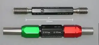 - Bekkalibers. Afhankelijk van de vorm van het te kalibreren werkstuk wordt een enkelvoudig of dubbel bekkaliber toegepast. Enkelvoudige bekkalibers worden eigenlijk alleen toegepast als slechts een van de twee grensmaten gecontroleerd hoeft te worden. Bij dubbele bekkalibers zijn de bij elkaar horende GO- en NO-GO-kalibers samengevoegd in één stuk gereedschap. Dat vergemakkelijkt het kalibreren. Soms zijn beide kalibers achter elkaar geplaatst. Op deze wijze hoeft het gereedschap niet gedraaid te worden, de controleur kan met één beweging de afmetingen van het stuk verifiëren.