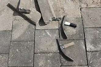 De kop heeft een pen in gebogen vorm en het uiteinde is beitelvormig geslepen. De stratenmaker en de metselaar hakken hiermee steen ruwweg op maat. Voor nauwkeurig werk gebruikt hij de vlakke baan om ermee op de koudbeitel, klezoorbeitel of sabel te slaan naargelang van het soort werk.