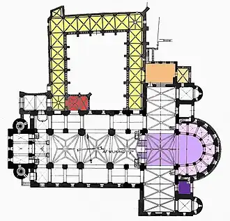 - ↑ Volgens de statuten van 1407 moesten de kanunniken en andere bedienaren van het kapittel acht keer per dag in de kerk samenkomen voor het zingen van de canonieke uren, zowel overdag als 's nachts. 'Deze canonieke uren of getijden bestonden uit acht gebedsdiensten. Aan het einde van de nacht zongen de kanunniken de metten, die onmiddellijk gevolgd werden door de lauden. In de ochtenduren stonden de priem, terts en sext op het programma. 's Namiddags werden de noon en de vespers gezongen. De completen of het avondgebed besloten de cyclus. De diensten bestonden vooral uit het zingen of reciteren van psalmen en hymnen, lezingen uit de bijbel of uit levens van heiligen en gebeden. Na de terts werd elke ochtend de hoogmis gecelebreerd'.[38]
