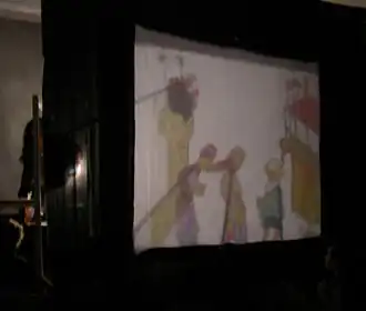 De lamp voor projectie staat bekend als een şem'a (letterlijk "kaars"), maar is meestal een olielamp. Beelden worden geprojecteerd op een wit mousseline scherm bekend als de Ayna ( "spiegel"). De projectie is vanaf de achterkant, zodat het publiek de poppenspeler niet ziet.