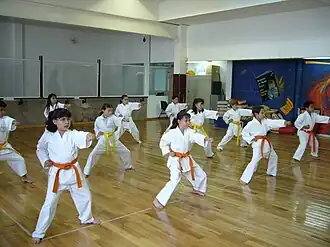 Jeugdige karateka's beoefenen karatestoten in een sportzaal in Mexico, 2006