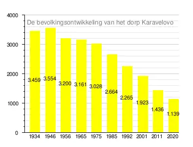 Op 31 december 2020 telde het dorp Karavelovo 1.139 inwoners.[1] Het aantal inwoners vertoont al vele jaren een dalende trend: in 1946 had het dorp nog 3.554 inwoners.