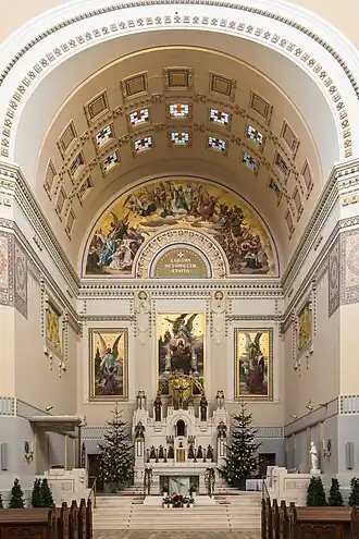 De glas-in-loodramen en de muurmozaïeken stammen van Leopold Forstner. De vier evangelisten in de pendentieven van de koepel en de decoratie bij de ingangen naar de zijkapel werden eveneens door Forstner vervaardigd. In de voorhal bevinden zich reliëfs van de beeldhouwer Johann Rathausky en Georg Leise.
