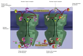 - ↑ (en) Poon, I. K. H. and D. A. Jans (2005). "Regulation of nuclear transport: Central role in development and transformation?" Traffic 6 (3): 173-186.