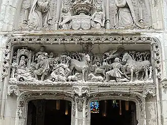 Op de bovendrempel van de poort is de jacht van Saint-Hubert afgebeeld. De glas-in-loodramen die nog recent zijn stellen perioden uit het leven van Saint-Louis voor. Het timpaan dateert uit de 19e eeuw en toont Karel VIII en Anna van Bretagne.