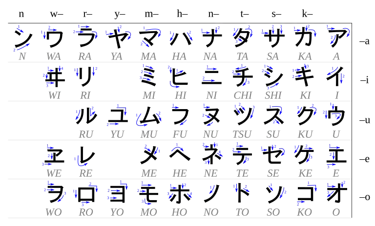 De volgende tabel toont de schrijfmethodiek van elk katakana-karakter. De nummers en pijlen geven respectievelijk de pennenstreek volgorde en richting weer.