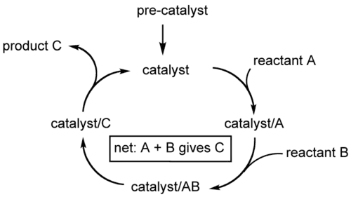 Het belangrijkste kenmerk van een gekatalyseerde reactie is dat de katalysator wel aan de reacties deelneemt, maar aan het eind van het proces weer onveranderd vrijkomt. Om deze reden worden katalytische cycli doorgaans als ring van chemische reacties geschreven. De eerste stap in de cyclus is meestal het binden van een of meer reactanten aan de katalysator, de laatste stap verbreekt de binding tussen katalysator en product waardoor de katalysator geregenereerd wordt.