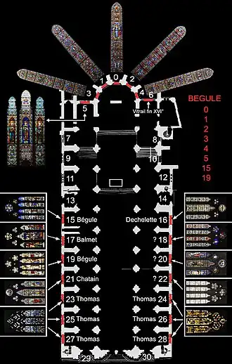 - Een glas-in-loodraam uit de 16e eeuw in de apsis van de rechter zijbeuk. Dit is het enige venster in de kathedraal van vóór de 19e eeuw. Het toont de Aanbidding der Koningen in het bovenste deel. In het onderste deel zijn rechts Mauritius en links Jacobus afgebeeld, met een knielende persoon, vergezeld van zijn patroonheilige, St. Antonius.