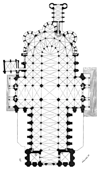 Waarschijnlijk werd het gebouw na 1194 in horizontale lagen opgetrokken, in 25 à 30 bouwperiodes. De bouwperiodes waren noodzakelijk, om de kalkmortel te laten drogen, krimpen en zetten. Dat duurde zes maanden of langer. In de wintermaanden kon men door bevriezing van de bindmiddelen niet bouwen. Problemen met de financiering van dit voor die tijd gigantische project zorgden ook voor bouwonderbrekingen. Men zocht het nodige geld bij elkaar via een handeltje in aflaten of verhoging van de belastingen. Er is een verschil in bouwtechniek in de massieve steunberen van het priesterkoor, en het lichte web van steunberen die het middenschip ondersteunen.
