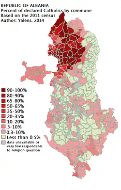 Volgens de volkstelling van 2011 vormen katholieken zo'n 10,03 procent van de bevolking. Zij wonen vooral in het noorden van Albanië. In prefectuur Lezhë vormen katholieken zelfs zo'n 72,38 procent van de totale bevolking en in prefectuur Shkodër vormen ze net geen meerderheid (47,19 procent van de bevolking).[3]