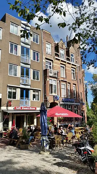- op huisnummer 38, een gemeentelijk monument uit 1898, ontworpen door Willem Kromhout; de knik in het plein naar de gracht is opgesierd met een markant torentje. In het gebouw aan het plein is al vanaf de bouw (en ook ver daarvoor maar dan op huisnummer 13, dat toen verdween) een apotheek gevestigd. Het gebouw vormt een groot contrast met de naastgelegen huisnummers 39-54, gebouwd in de jaren zeventig.[4]