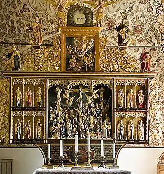 In de kerk staat een vijfvleugelig altaar met houtsnijwerk uit circa 1500 opgesteld. Het toont een kruisigingsscène met veel figuren en op de zijvleugels de twaalf apostelen. De bekroning van de kunstenaar Peter Petersen met de Opstanding en de beelden van de evangelisten en een engel werd rond 1700 op het altaar geplaatst. Tegelijkertijd werden de zijvleugels met rankwerk versierd. De achterkant van de altaarvleugels werd beschilderd en in gesloten toestand is de lijdensgeschiedenis van Jezus te zien.