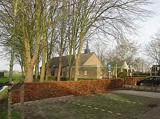 Het betreft een bakstenen gebouw met zadeldak, met vooruitspringende zijvensters en een dakruiter in de vorm van een vierhoekig torentje met hoge naaldspits.