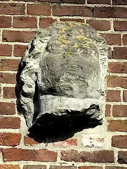 Boven de ingang is er een stenen kop ingemetseld, mogelijk een Apollokop van Romeinse oorsprong, afkomstig uit de vroegere, afgebroken parochiekerk. Volgens de overlevering bestond er tot in de 19e eeuw een gebruik waarbij communicanten stenen naar dat afgodsbeeld gooiden om het heidendom af te zweren.