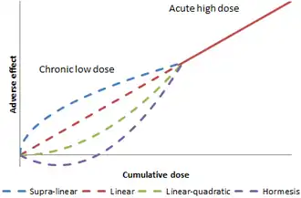 Dat de effecten van een hoge dosis ioniserende straling grote nadelige gevolgen voor de gezondheid hebben, is geen controversieel onderwerp. Anders is dat bij de effecten van een lage dosis. Lange tijd wordt al gebruikgemaakt van het linear no-threshold model (lineair verband zonder drempel) (LNT). Volgens dit model is er een lineair verband tussen de dosis straling en de schadelijke effecten. Dit wordt ondersteund door diverse onderzoeken en organisaties als de United States National Research Council hangen dan ook dit model aan. De laatste jaren zijn er echter ook onderzoeken gedaan die tot andere conclusies komen. Volgens sommige modellen zou er zelfs sprake zijn van een drempelwaarde (threshold) waaronder straling gezondheidsbevorderend is.[5][6][7]