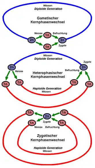 | Diplohaplont Diplohaplo- fasische cyclus (afzonderlijke haploïde en diploïde generaties) Sporische meiose → |
