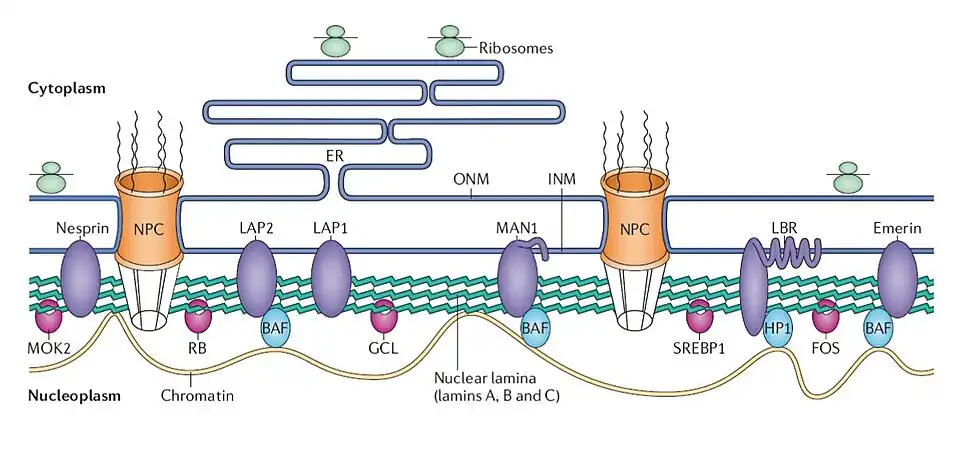 De lamine-geassocieerde membraaneiwitten regelen de interacties van de kernlamina met het binnenste kernmembraan. Belangrijkste van deze membraaneiwitten zijn de zogenaamde LAP1 en LAP2-eiwitten, de emerinen en de nesprinen.