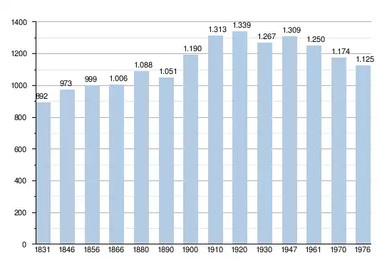 - Bronnen:NIS, Opm:1831 tot en met 1970=volkstellingen; 1976 = inwoneraantal op 31 december