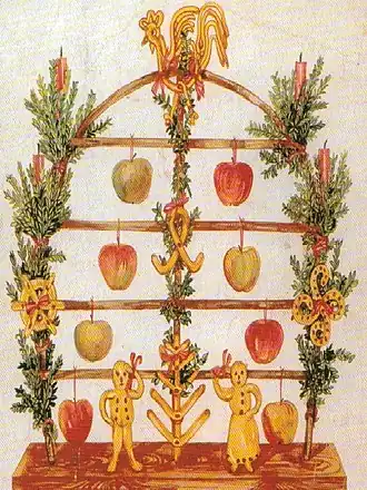 - Het in huis halen van groenblijvende bomen en planten, zoals een adventskrans, kerstkrans, kerststuk, kerstster, hulst of maretakken en/of het gebruik van hooi of stro (voor de rendieren van de kerstman of als symbool voor de kribbe, maar ook als kerstversiering of kostuum). In veel gebieden wordt de kerstboom geplaatst en met kerstversiering (zoals kerstballen, kerstfiguren, slingers, engelenhaar, traditionele lekkernijen zoals zuurstokken en koekjes, kaarsjes of kerstboomverlichting en een piek) opgetuigd;